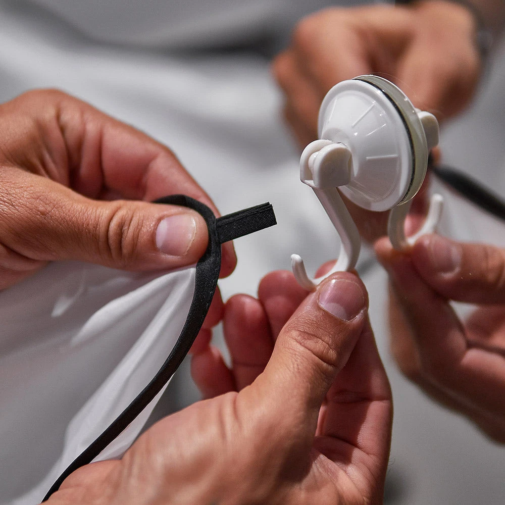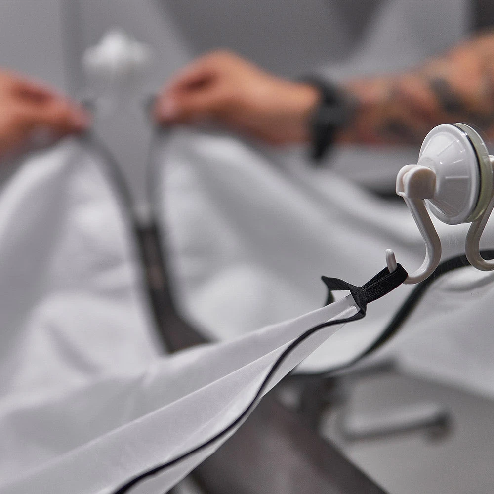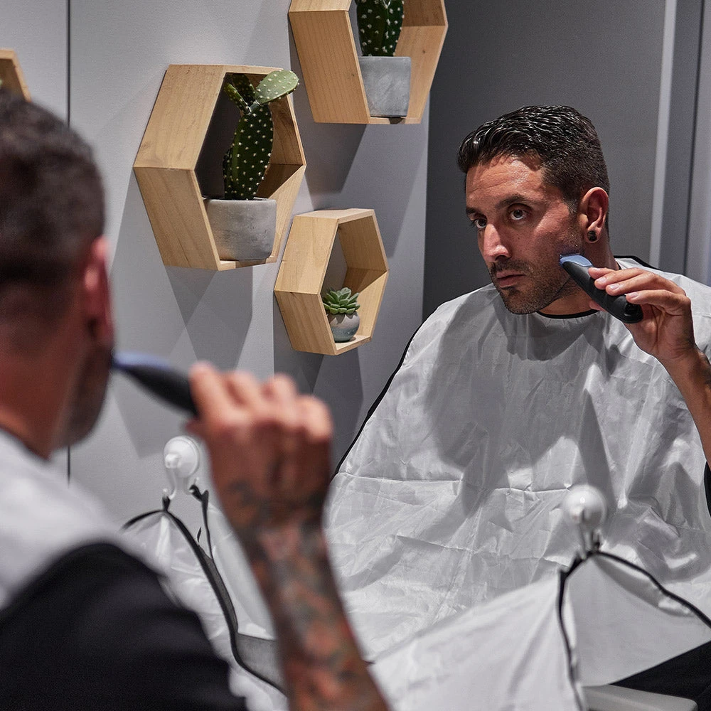 Slip it around your neck and use the two included suction hooks to pin it to the bathroom mirror. It’ll catch the hairs as they fall so you can dispose of them with ease. instead of leaving them in the sink.Â