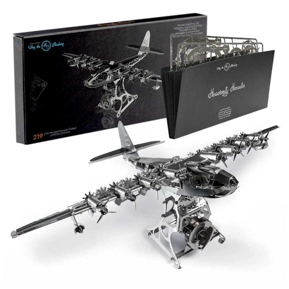 This model plane is crafted from polished stainless steel. You get all the pieces you need to make your own plane with a base. You can wind it up to watch mechanics make the propellers spin along the plane’s wings.Â