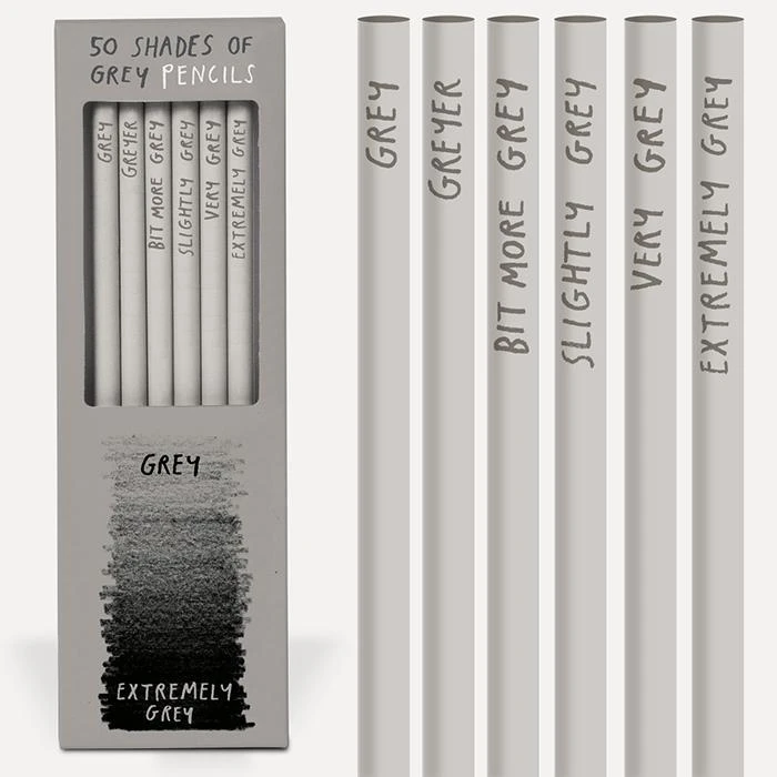 - Messages printed on pencils include “grey” and “very grey”