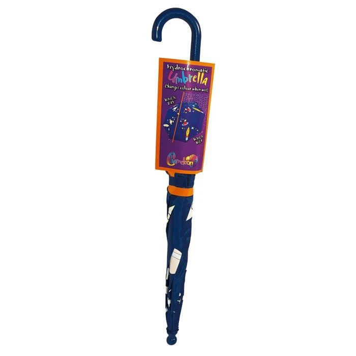 The white hydro chromatic ink covers the brightly coloured rockets and stars on the dark blue polyester cover of the umbrella. When the ink gets wet, it becomes transparent and reveals the vibrant rainbow magic underneath.