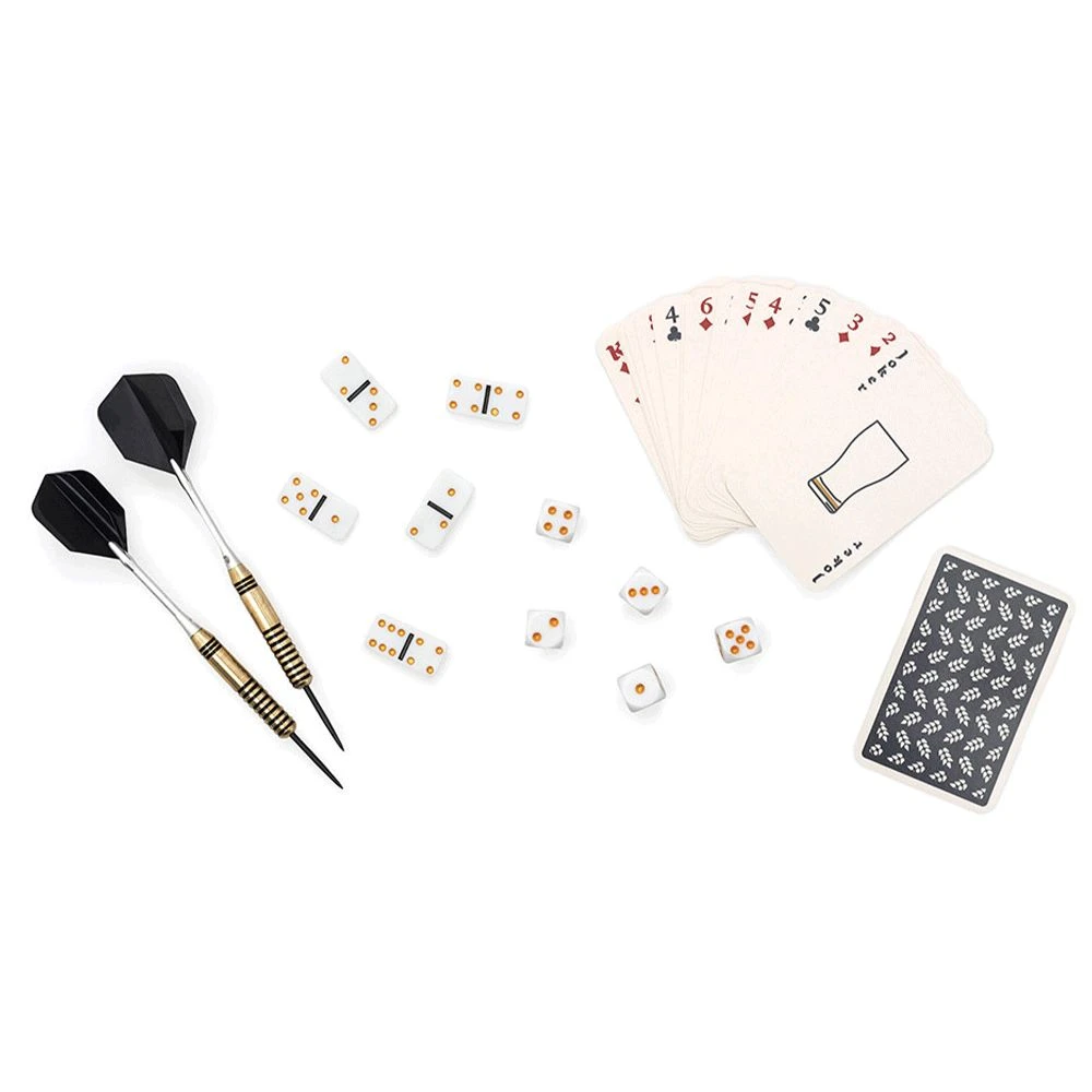- Includes: Dominoes set, set of darts, 5 x bar dice, deck of 52 cards