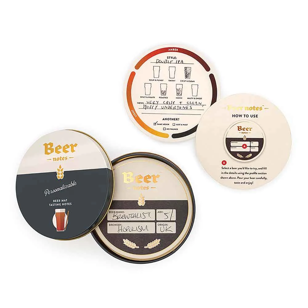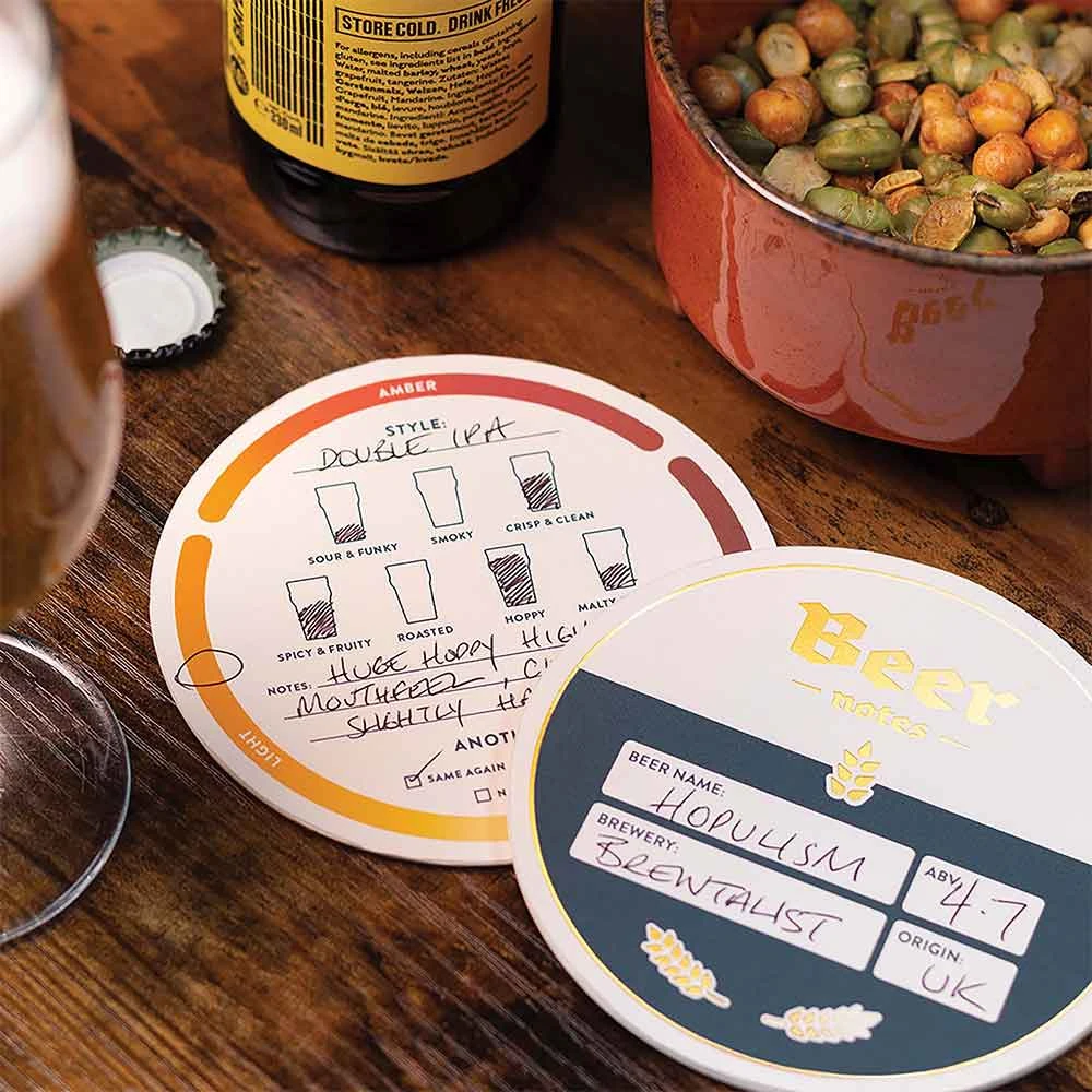 Take notes on your home tastings with these great coasters. On one side you can record the name, ABV %, brewery and origin. On the reverse, you can take tasting notes including colour-in pints for common flavours, a scale for colour and whether you would order that one again.Â