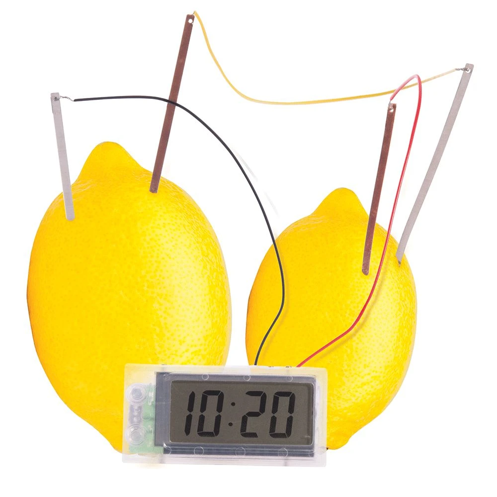 - Includes: Digital clock, 2 x zinc strips, 2 x copper strips, connection wire, holographic disc, motor, solar panel, instructions