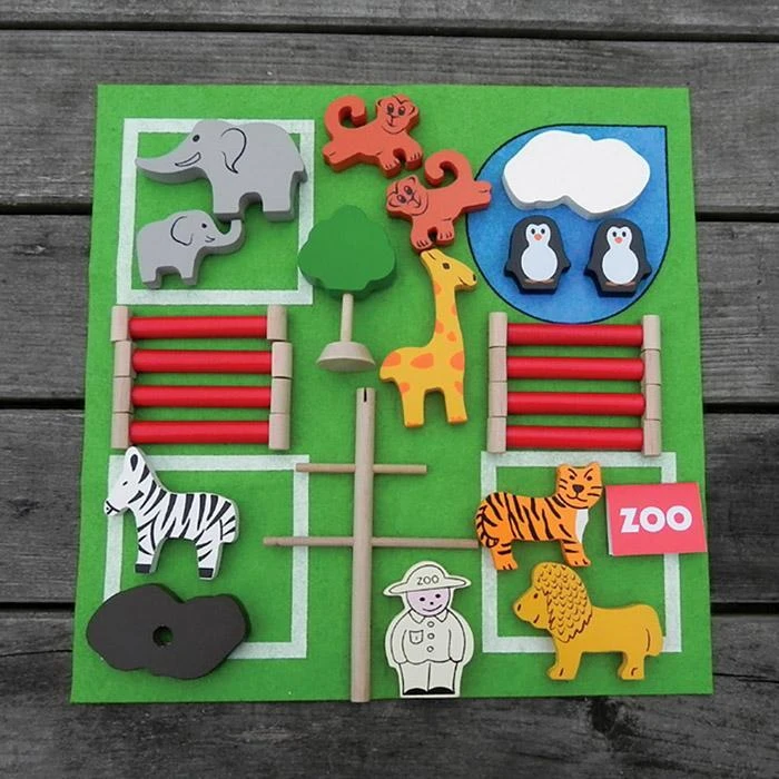 This play set includes: Assorted wooden zoo animals, a keeper, a sign, a tree, an ice float, fencing, a play mat.