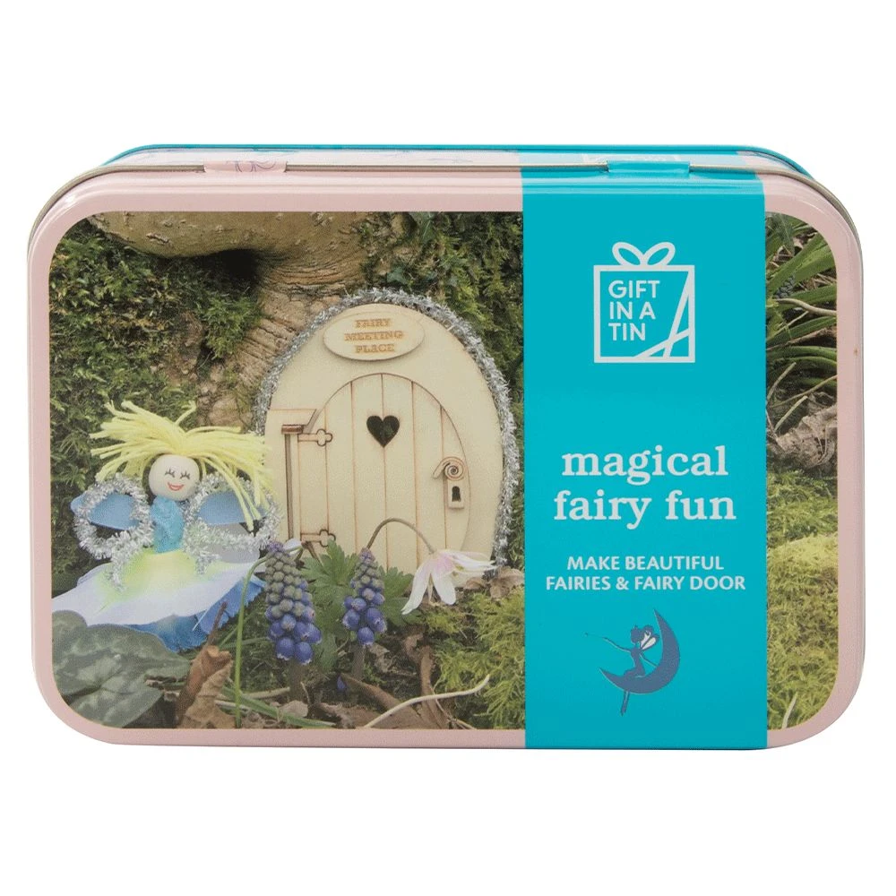 Each tin comes with fabric petals, wooden heads and pipe cleaners to create your own beautiful fairy friends, plus a wooden door kit with glue to make a little doorway to a fairy home or meeting place!Â