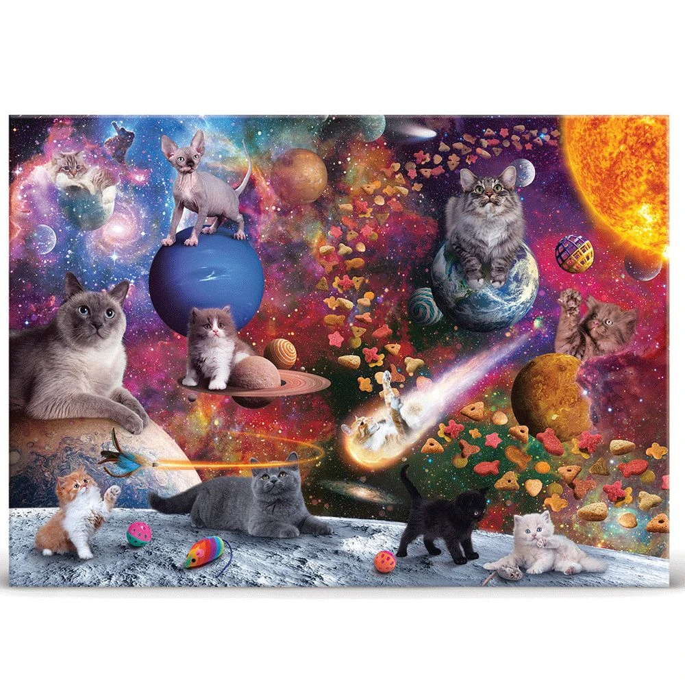 These cats have turned outer space into their own little playground, a galaxy of fun! There’s cat kibble floating through space and little toys waiting for them on one of the planets.Â