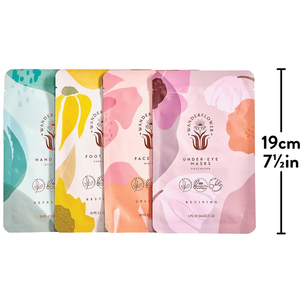 - Inclusions: Hibiscus face sheet mask, rosewater under eye mask, aloe vera hand sheet mask, sunflower foot sheet mask