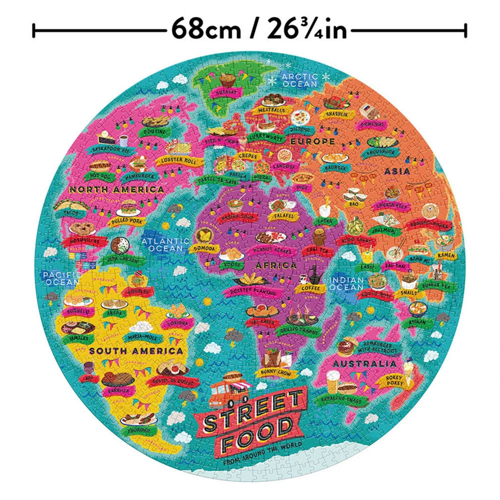 Celebrate the most delicious, most photogenic and even the most strange street foods around the world with this awesome round 1000 piece puzzle. Try some poutine in Canada, enjoy a Turkish pide and then head back down under for a snag!