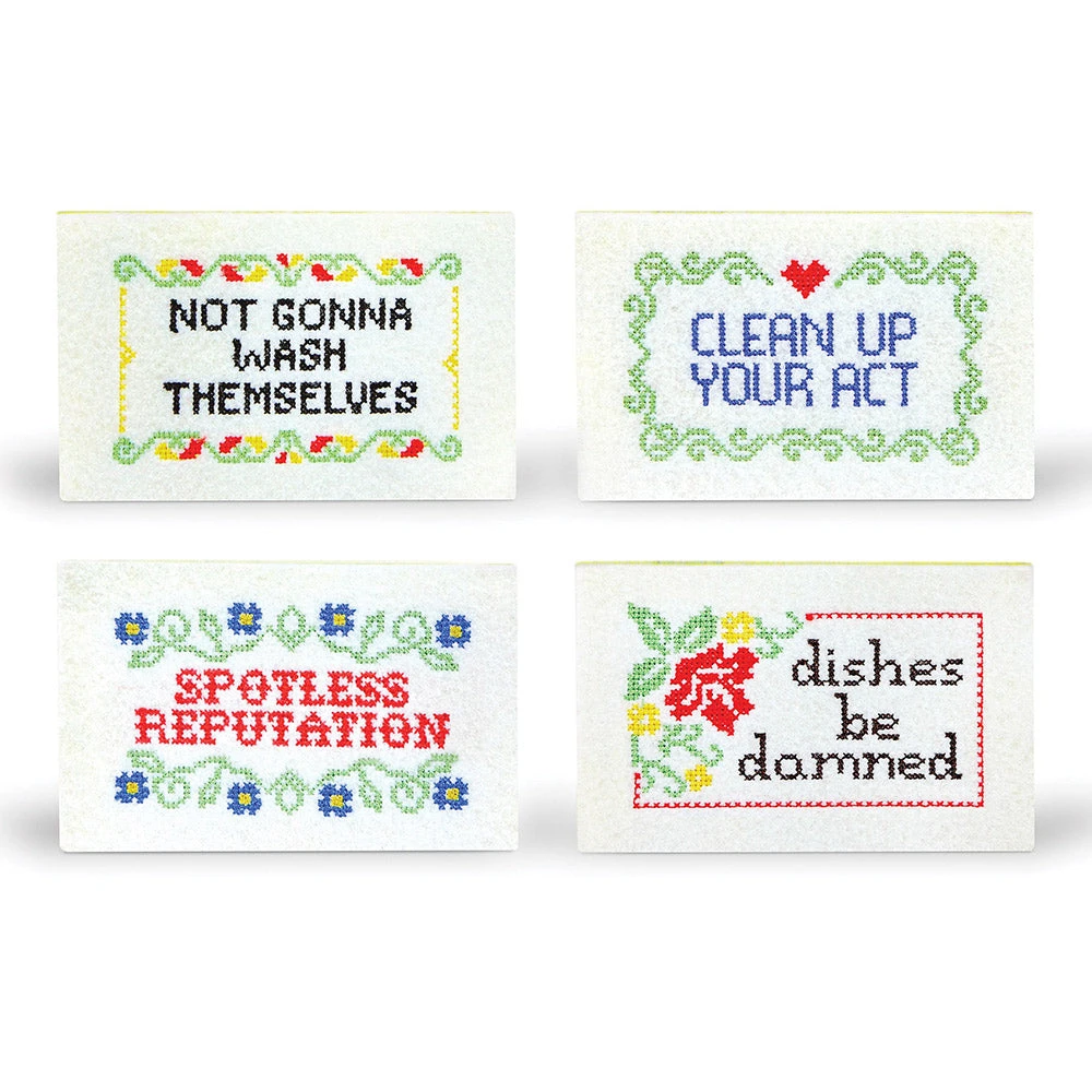 There’s four different sponges depending on how you feel about the dishes on any given day. There’s the passive aggressive approach with “Not Gonna Wash Themselves” or the more direct “Clean Up Your Act”. Remind them of your “Spotless Reputation” or the complete opposite with “Dishes be Damned”.Â