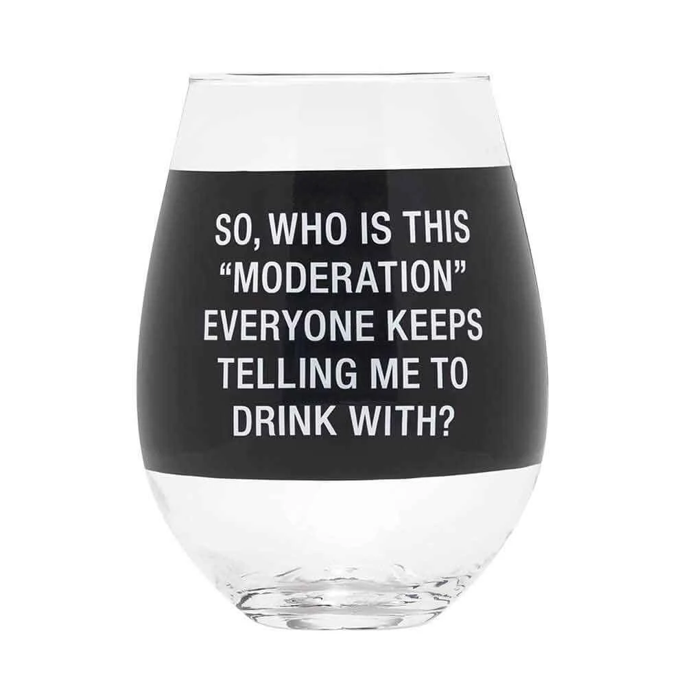This cheeky stemless glass is perfect for a serious wine lover! It’s having a cheeky dig with “So, who is this “moderation” everyone keeps telling me to drink with?” printed on the front. Which is made all the funnier when you realise the glass holds a whopping great 887ml! That’s more than a whole standard bottle of wine!Â