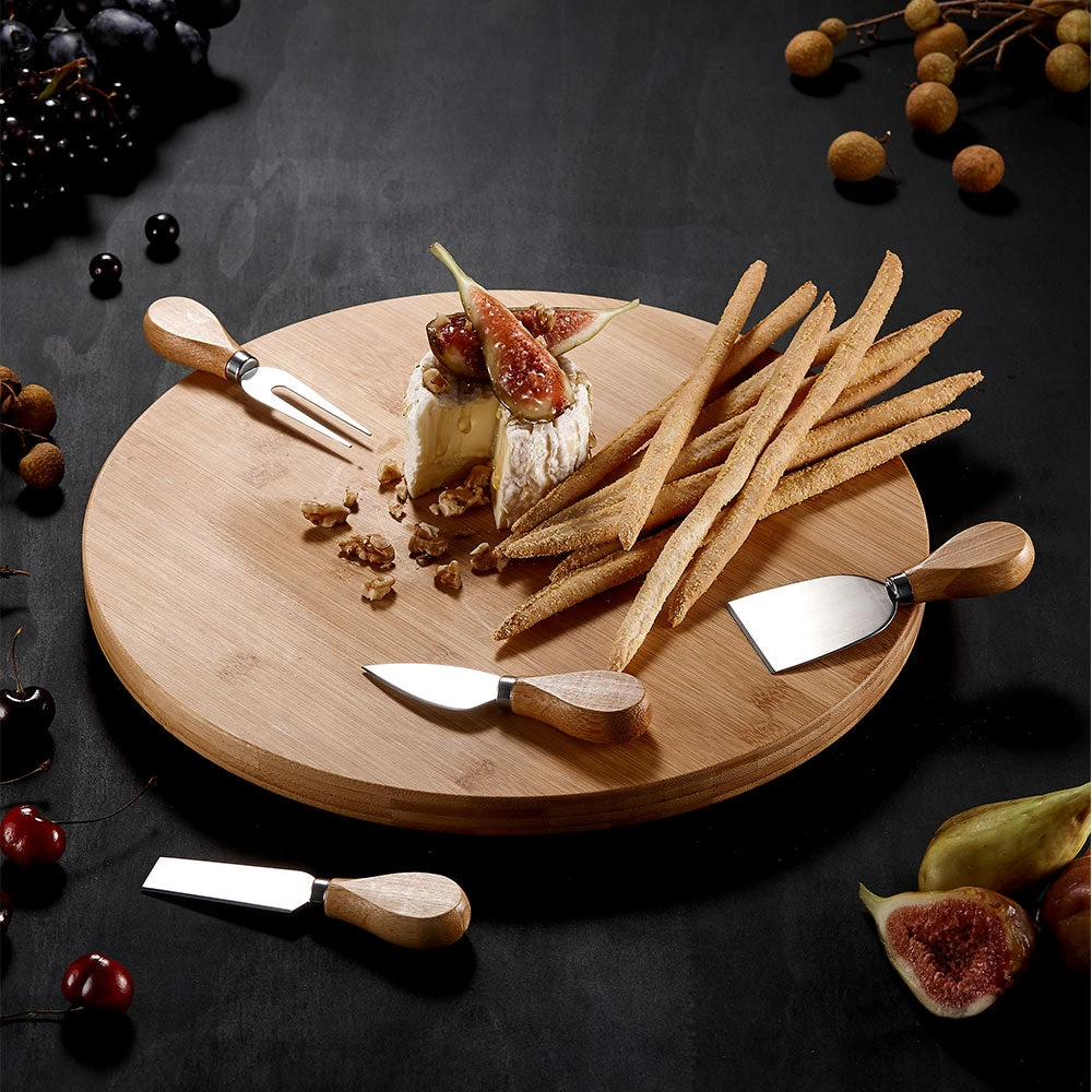 It’s a bamboo “Lazy Susan” style serving board, so you can easily turn it to bring your favourite deli meats or brie closer to you. In the base, there are four stainless steel chesses knives stored in cut-outs with built in magnets.Â