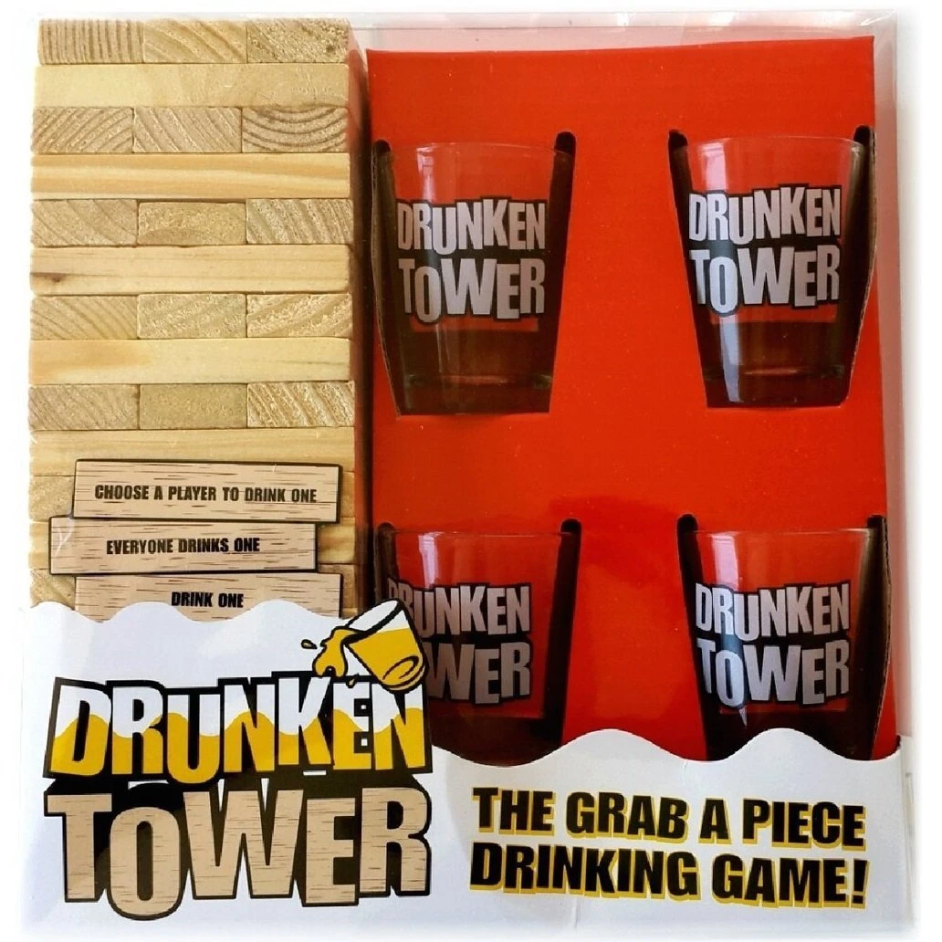 The game includes 4 shot glasses, the blocks to build the wooden tower, and game-playing instructions. Hours of tower fun are yours to be had with this game!