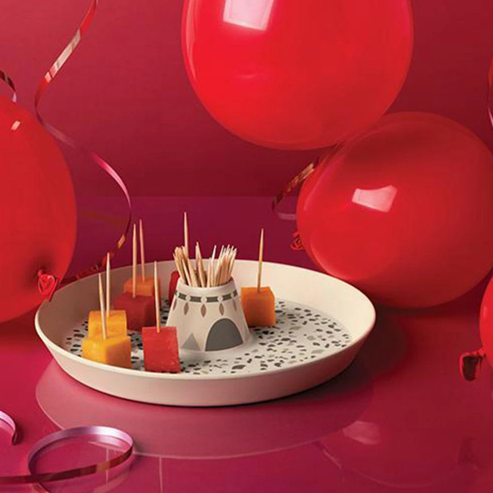There’s a tee-pee in the middle to hold your toothpicks so guests can select their snacks without worrying about germs. The base has a stylish terrazzo print in natural colours to suit every occasion.Â