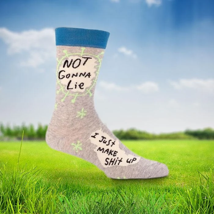 Even The Queen of England wears these socks. Okay, I just made that sh*t up. If you’re a fanatical fibber, these socks are for you. We know sometimes it’s easier to just make sh*t up rather than tell the truth. These socks are slightly sneaky though… like any liar. Above the ankle it reads “Not Gonna Lie.” If you wear them with shoes that’s all anyone will see. But below the ankle where the shoe covers the sock it reads, “I Just Make sh*t Up.” So the truth may be there, but just like a liar’s story; it’s hidden.