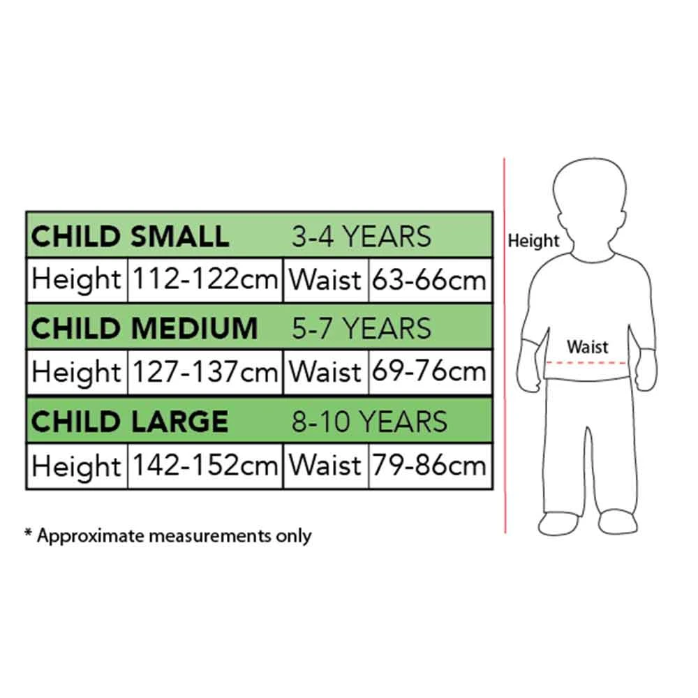 - Sizes:Â S (3-4 years), M (5-7 years), L (8-10 years) (see size chart for more information)