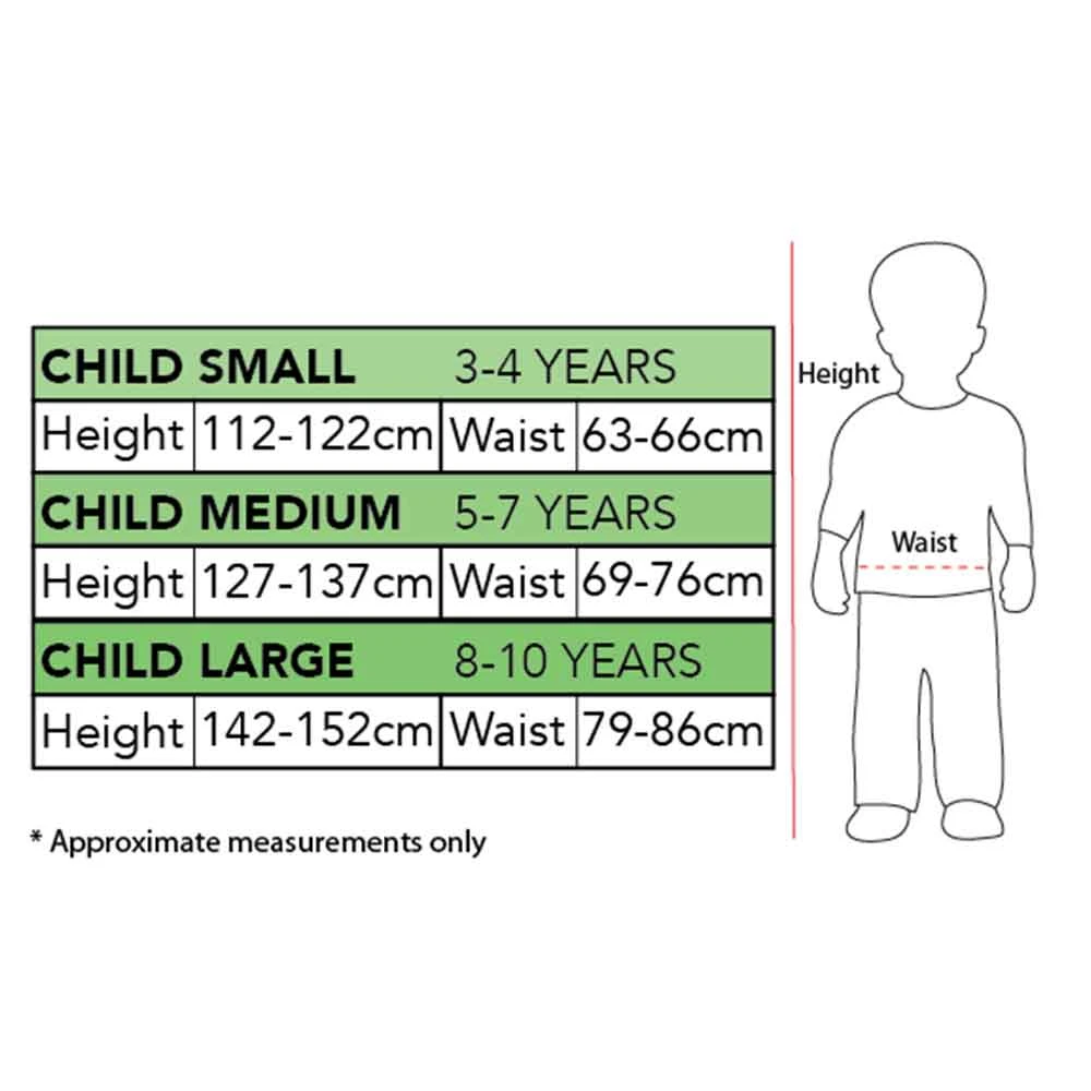 - Sizes: 3-4 years, 5-7 years, 8-10 years (see size chart for more information)