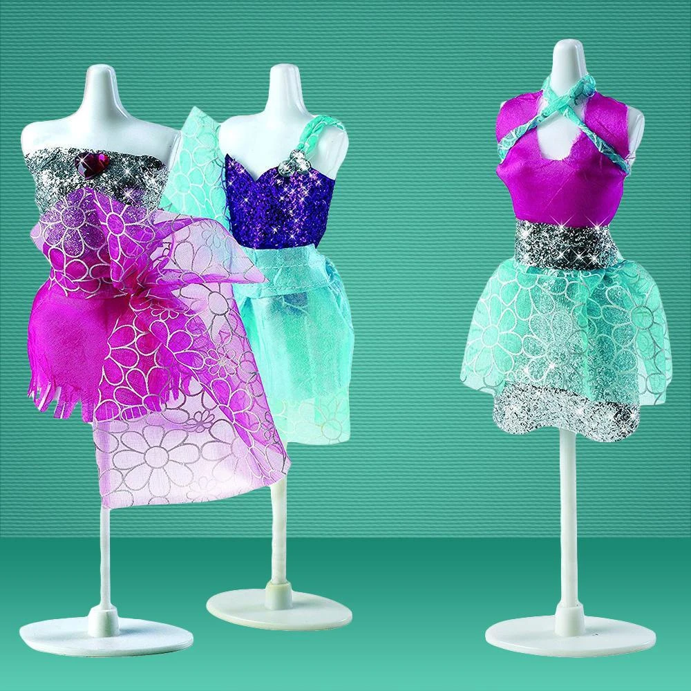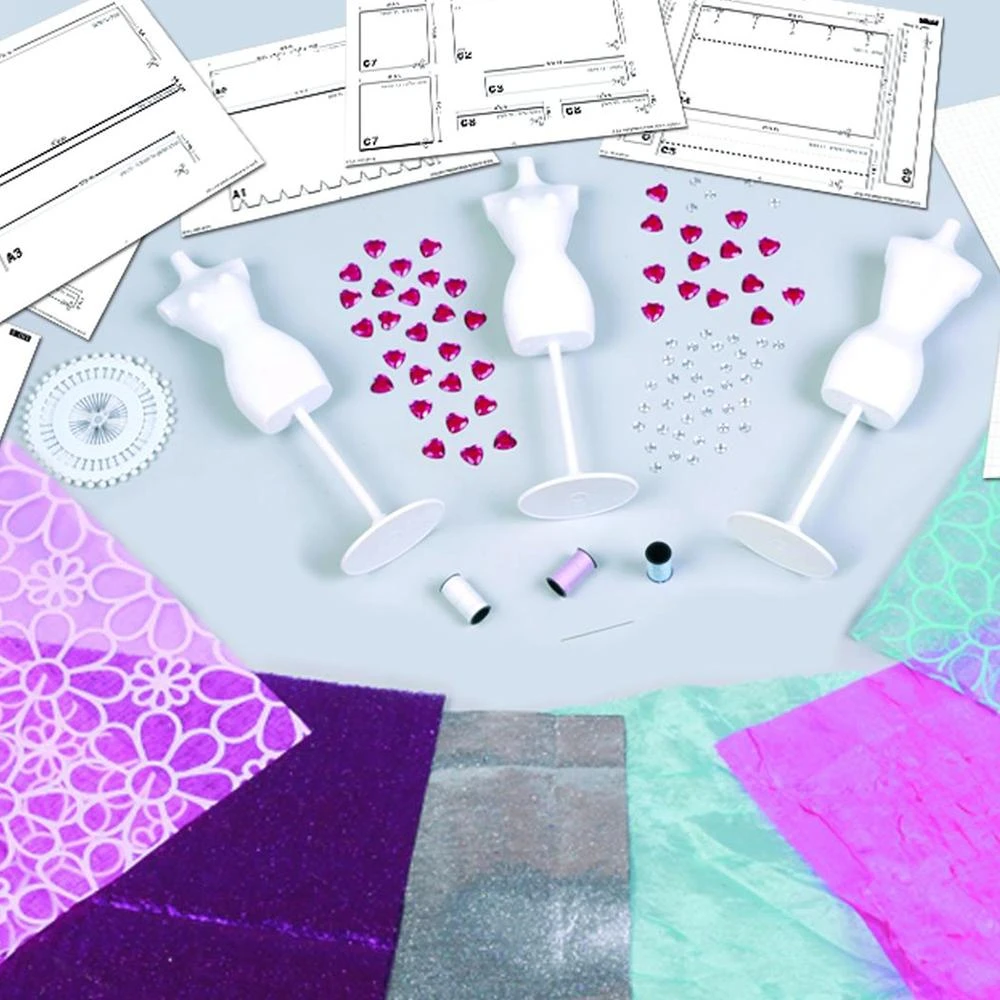 - Inclusions:Â 3 x 22 cm plastic mannequins, 1 pin wheel, approx. 80 rhinestones, 6 pieces of fabric, 3 spools of thread, 1 x needle, 3 x patterns,1 x 16-page sketchbook & detailed instructions