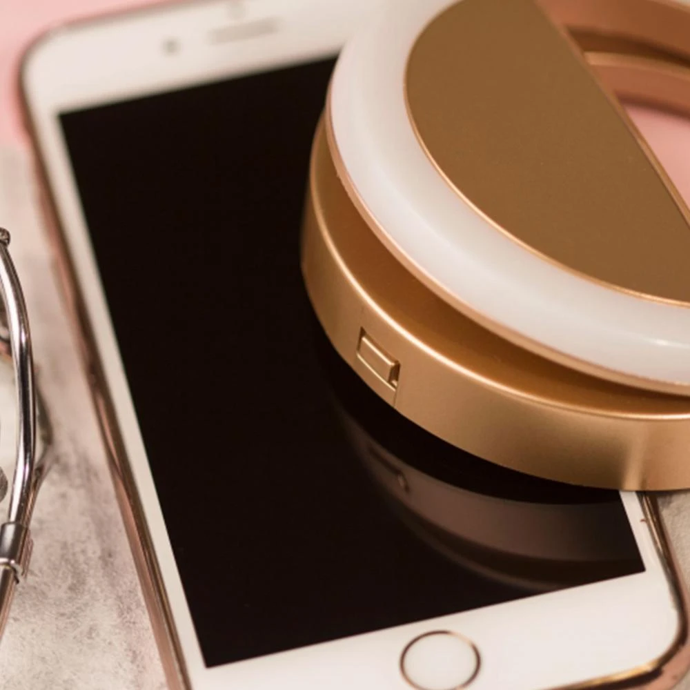 Choose from the bigger ring light or the compact mini glow light to suit your needs. The larger ring light will make you feel like you’re in a professional studio with 36 LED lights built in. It runs on AAA batteries and clips right onto your phone.Â