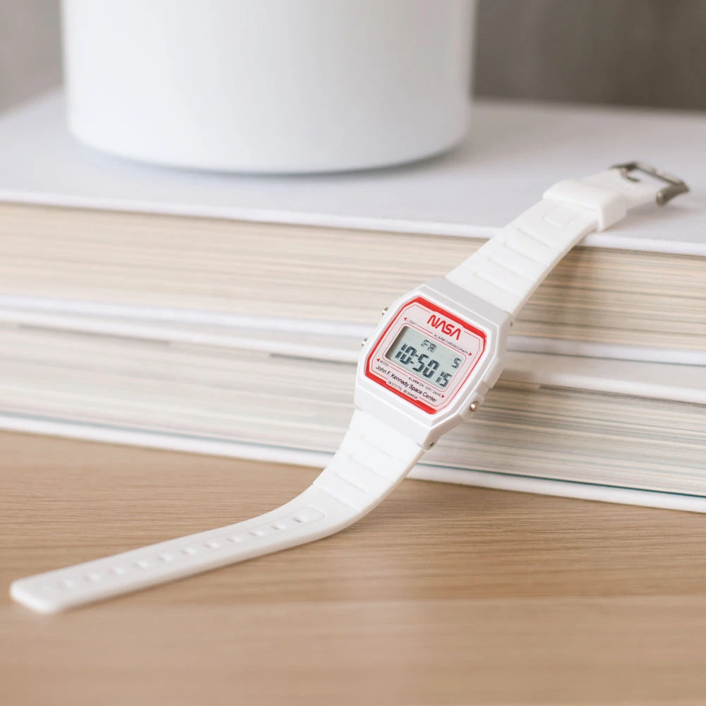 Officially licensed by NASA, this digital multifunction watch is perfect for little wannabe spacemen and big explorers alike. Bringing the retro design to life is the watch bands in beautiful spaceship white and the iconic NASA logo in red on the watch face.
