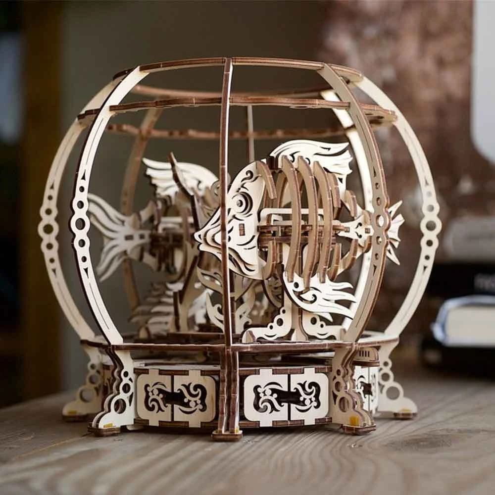 Once the pieces are built you’ll have a small mechanical aquarium! At the very centre is a tiny seahorse, with a ring of algae rotating one way around it, and larger fishes swimming in the opposite direction around that.Â