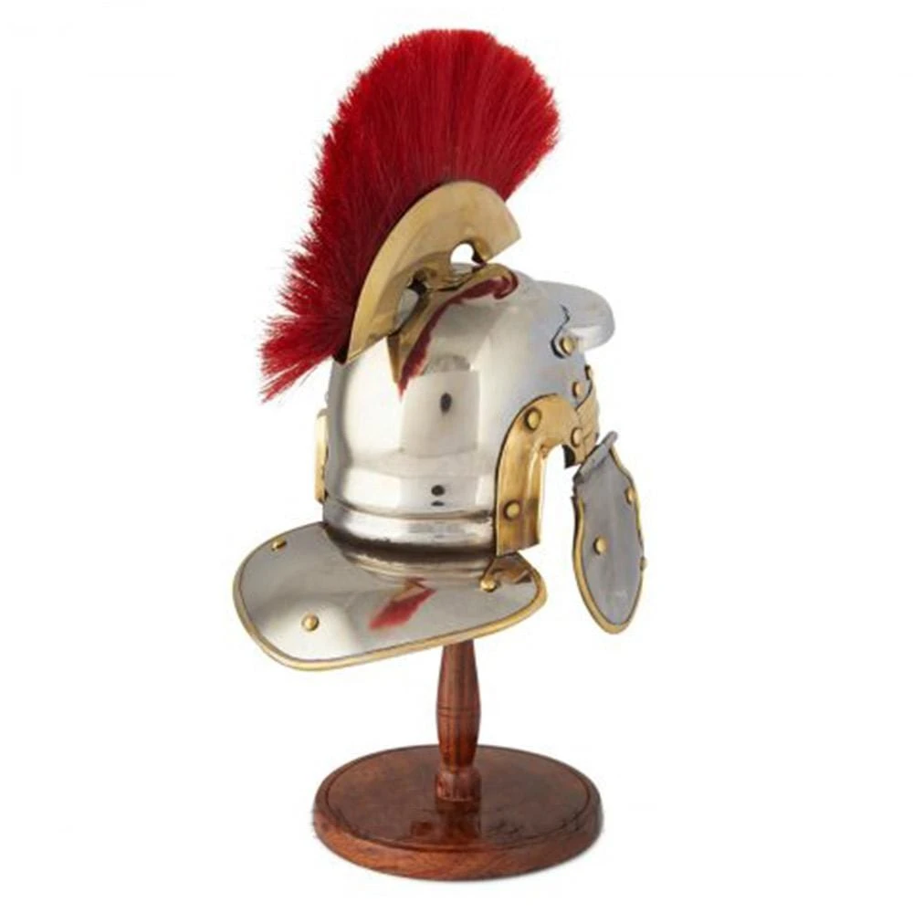 The chrome and brass finish bring a level of grandeur to your decor or historical memorabilia collection. And the carefully handcrafted details hold up to close scrutiny, like moving hinges on the cheek guards and the magnificent red plume.Â