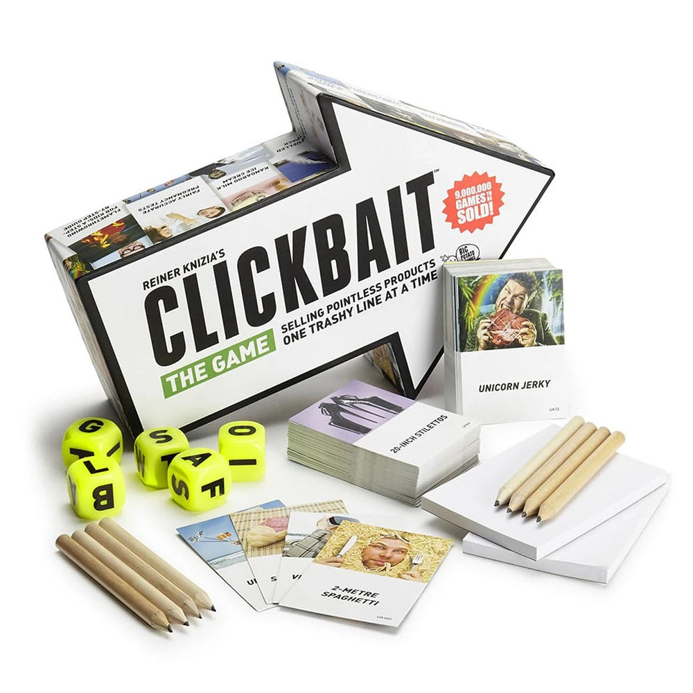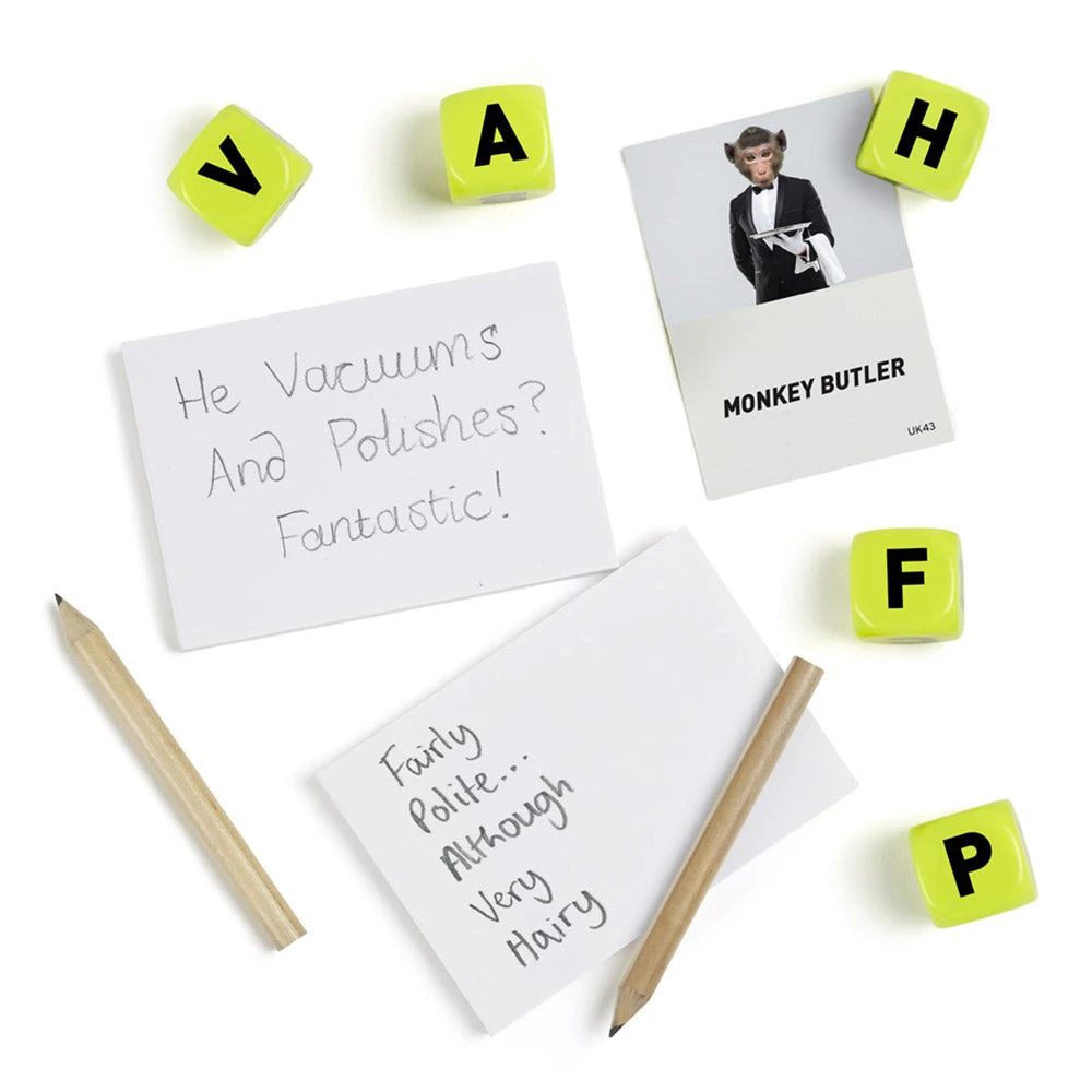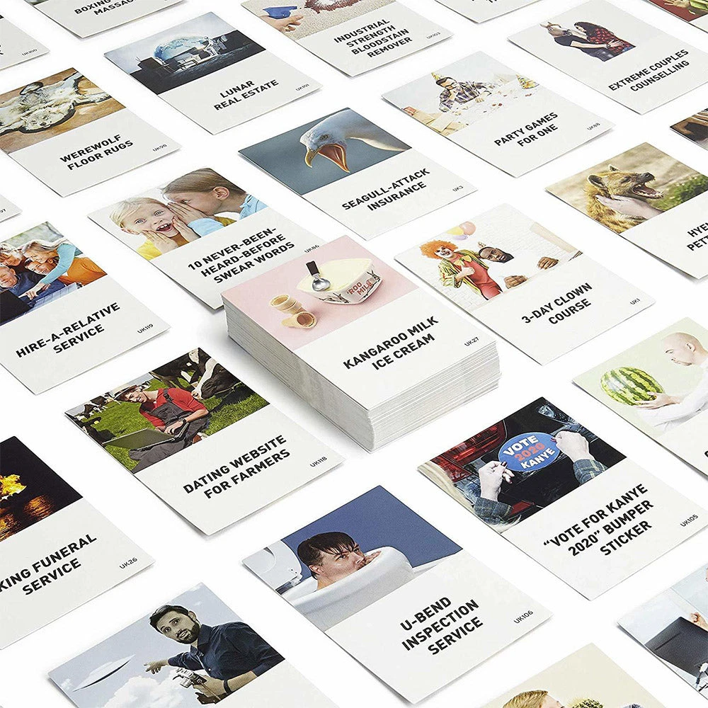 Pull a card from the deck to find out the pointless product you’ve got to sell on the internet. Roll the dice to get the 5 letters your’re working with.Those letters make an acronym that you’ve got to use to create a catchy phrase to sell your ridiculous product!