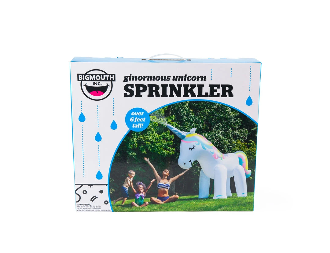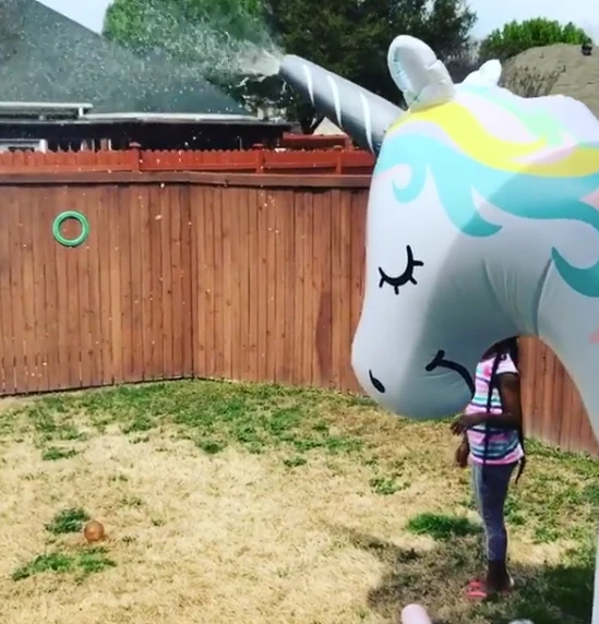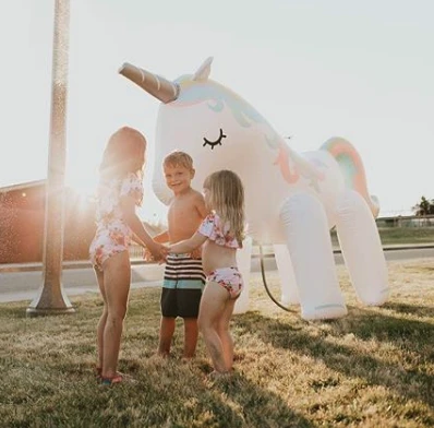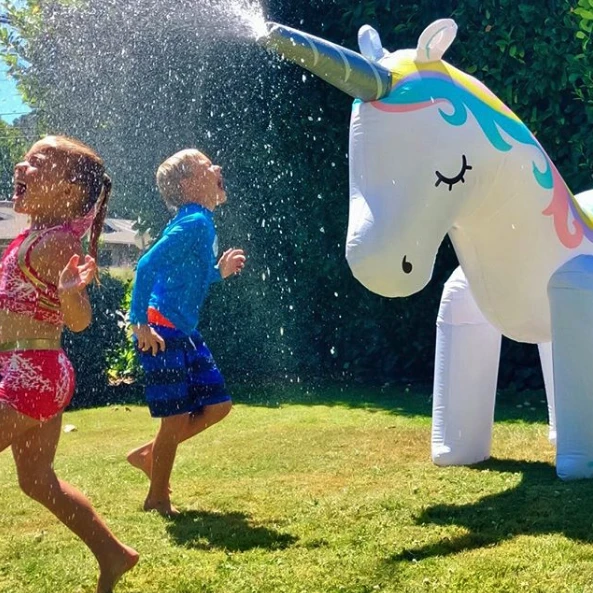 She sprays water out of her magical horn to keep you cool when the sun’s rays are strong – she’s the Giant Inflatable Unicorn Yard Sprinkler!