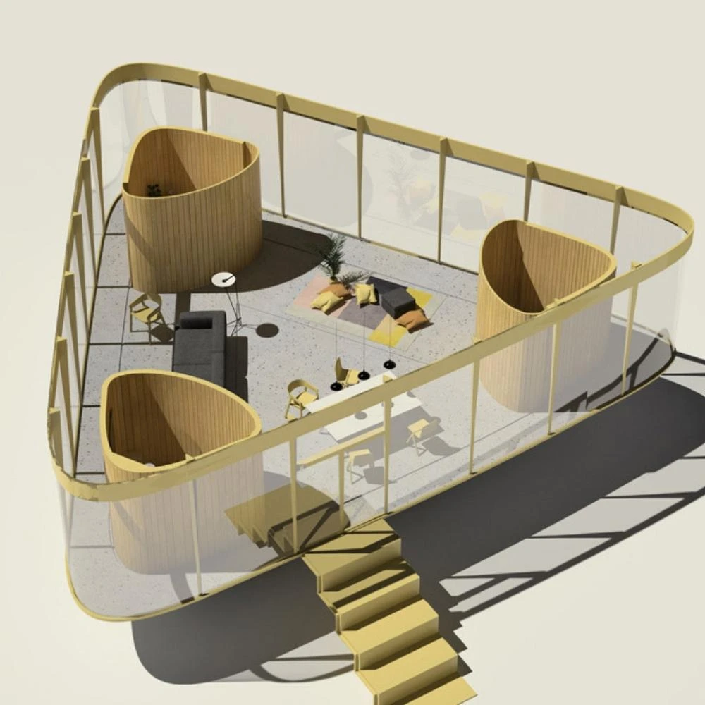 The modern triangular kit home is 85 square metres (914 square feet). It’s divided into a living space and a rooftop pool. It’s designed to be a summer home where you can engage with nature.