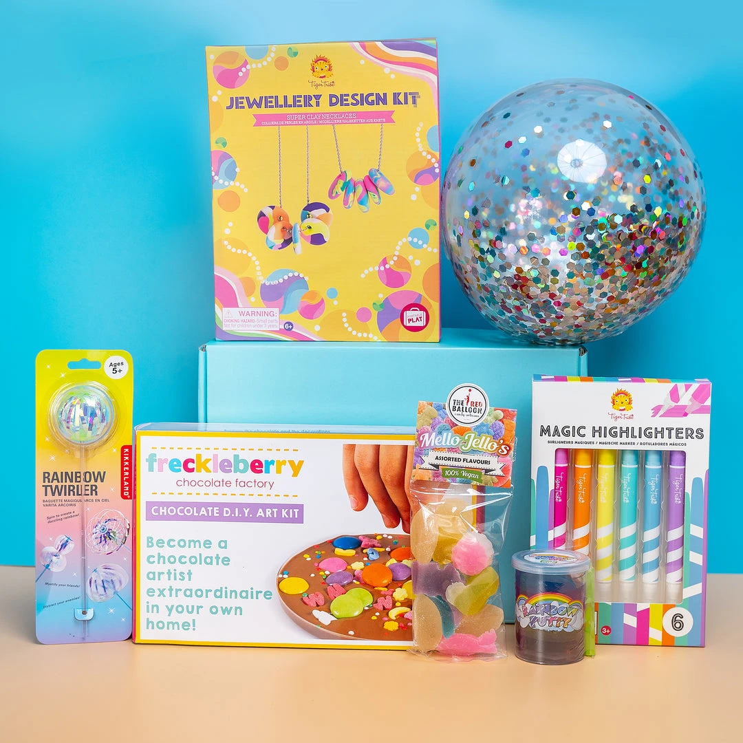 - Inclusions: Tiger Tribe Jewellery Design Kit for Super Clay Necklaces (Includes 2 x Super Clay Colour Pots – 8 colours, 2 x Necklace Chains, Clay Modelling Tool, Visual Instructions), Rainbow Bubble Putty (24.2.x 18 x 8.2 cm), Kikkerland Rainbow Twirler (23 x 4.5 x 4.5 cm), Tiger Tribe Magic Highlighters (Includes 6 non-toxic, quick drying dual tipped magic highlighters), Assorted Giant Confetti Balloons (85cm in diameter), Freckleberry Chocolate DIY Art Kit (Includes 5 x Chocolate Moulds, 5 x Bags & Header Cards, 1 x Set of Instructions, 8 x Edible Decorations, 1 x 250g Bag of Premium Belgian Chocolate For Melting), Mello Jello’s Assorted Candies (120g).