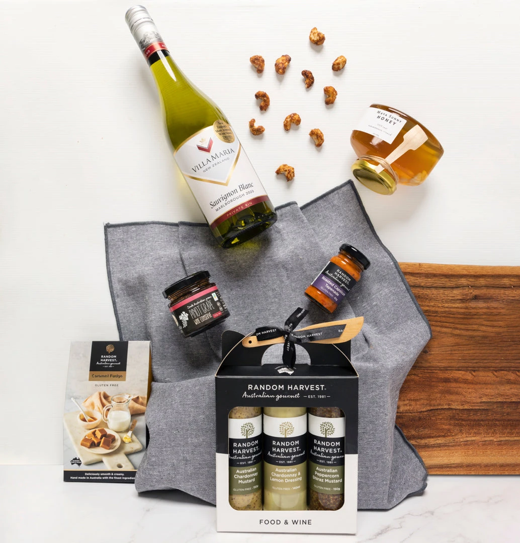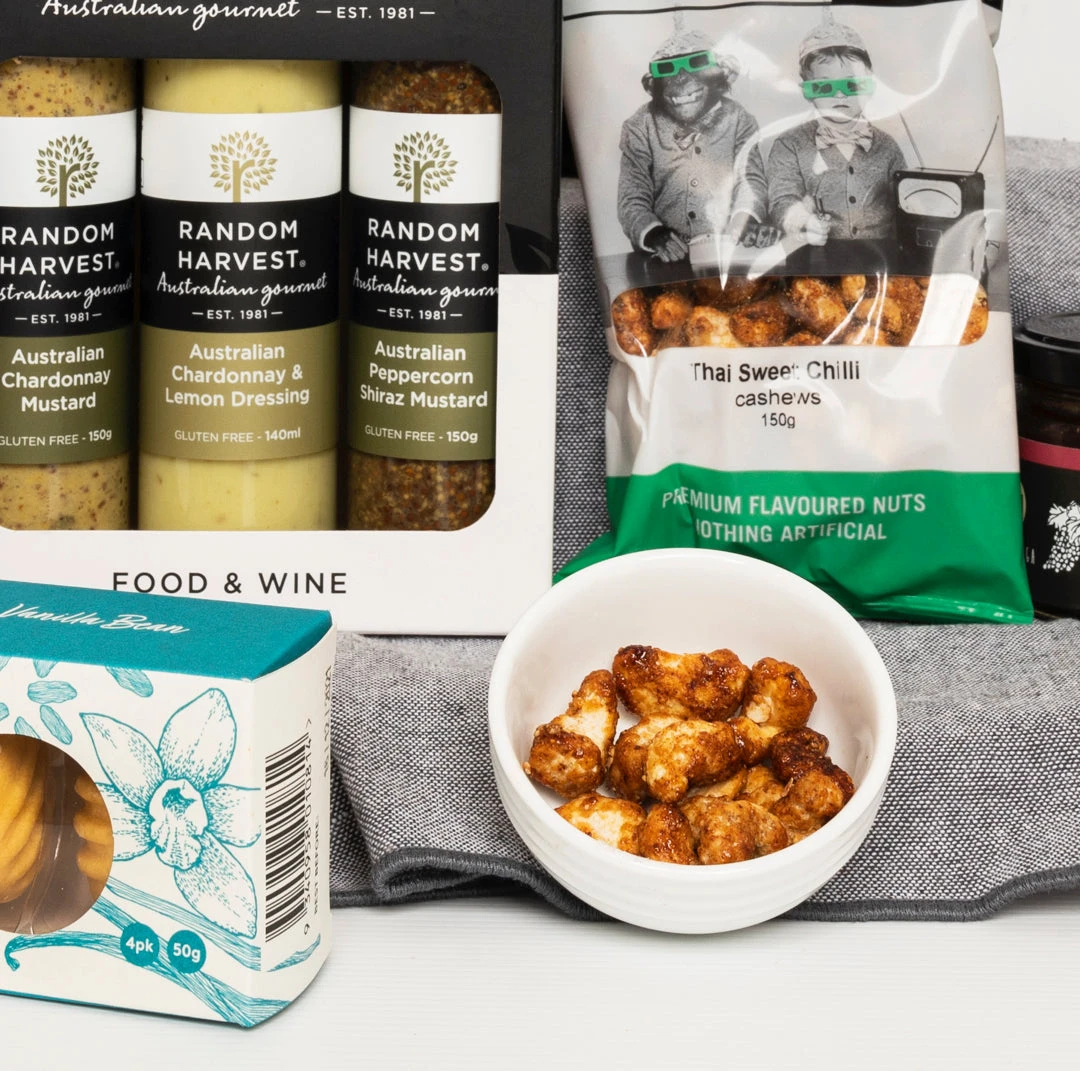 Create a flavour-packed feast to suit the wines with the incredible included goods. Your next cheese platter will be perfected with the pinot grape conserve, a strong flavour that pairs perfectly with rich and creamy cheeses. Or you can snack on the spicy Thai sweet chilli cashews.