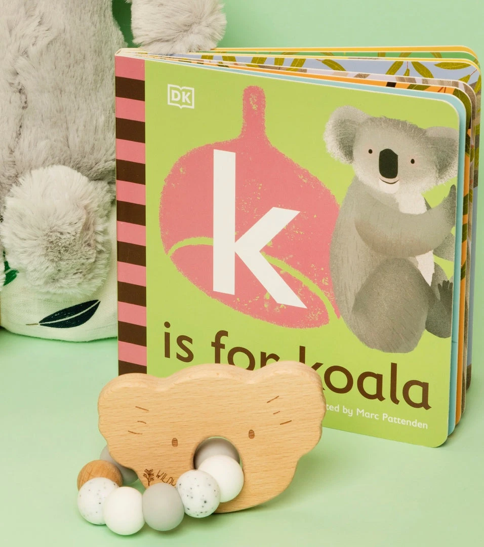- Inclusions: K is For Koala Board Book, Jellycat Bashful Koala Medium (20cm head to toe), Gum Leaf Bamboo Print Wrap (120 x 120 cm), Koala Teether In Grey Mix.