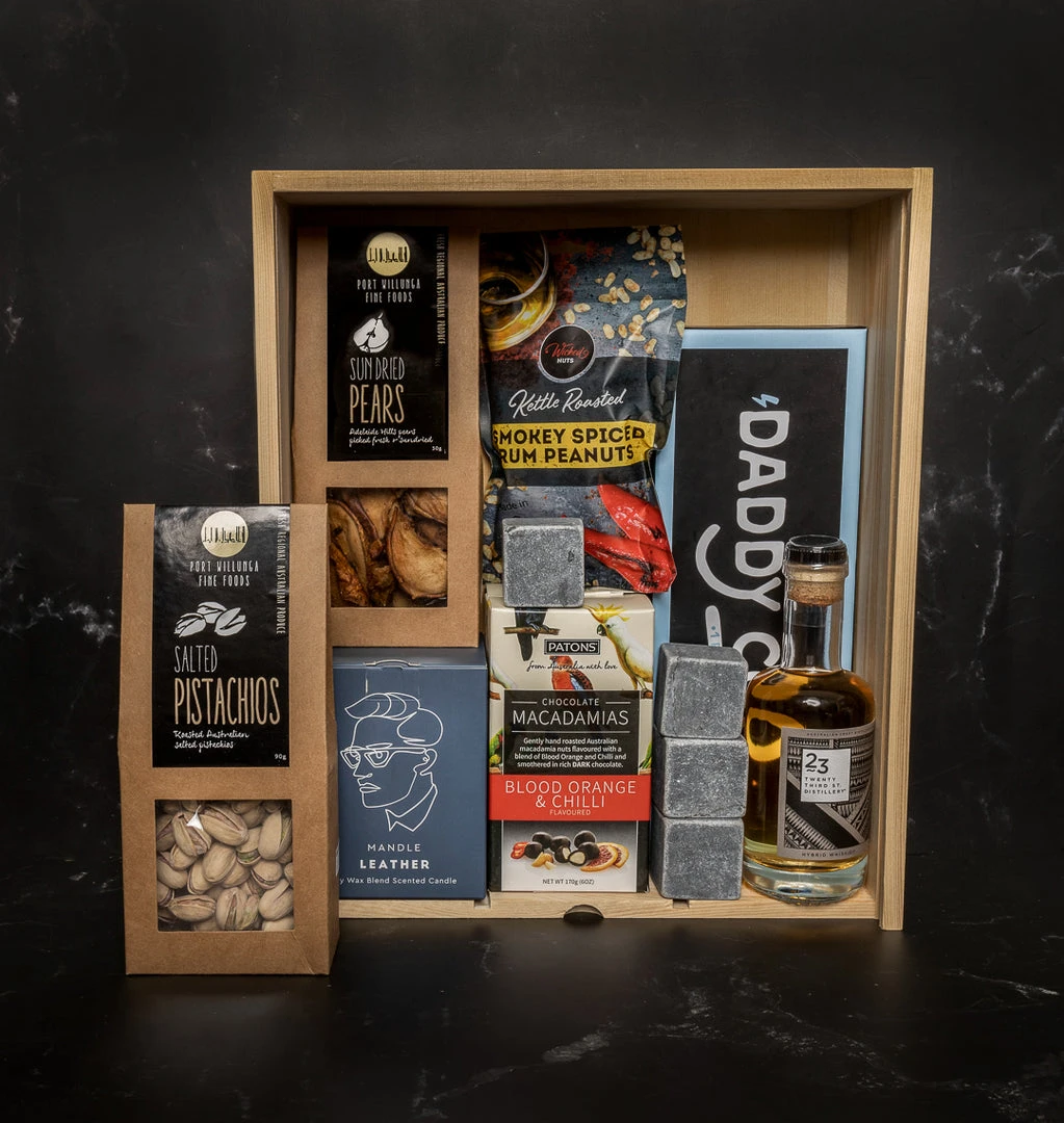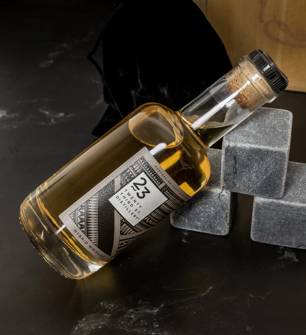 It comes with a bottle of 23rd Street Distillery Hybrid Whisky, a fine Australian offering to satisfy even the most discerning tastes. It comes with a set of whisky stones to cool your drink without any dilution.Â
