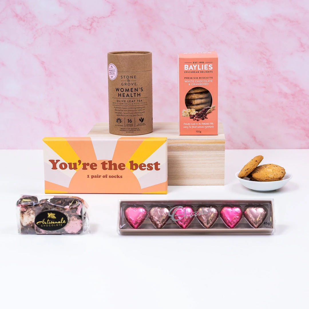When she’s ready for a deliciously sweet snack, there’s lots of Aussie made treats for her to enjoy. Maybe she’d like a premium white chocolate and cranberry cookie to dip in her tea? Maybe she’d like a decadent chunk of rich rocky road made in Australia with artisanal French chocolate? Or perhaps some adorable Chocolatier hearts?