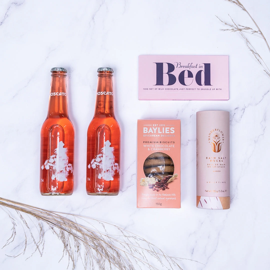 - Includes Moscato, chocolate, cookies and bath salt rocks