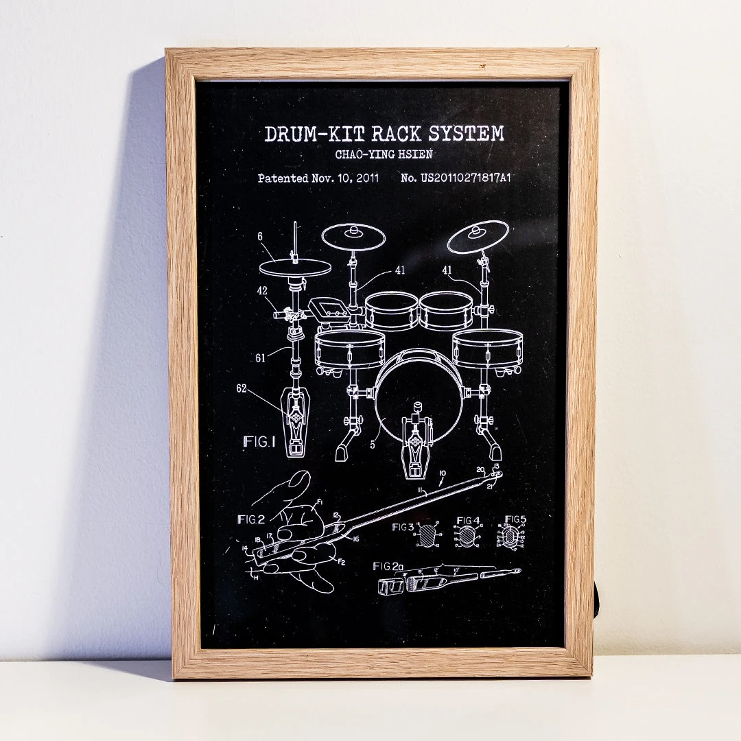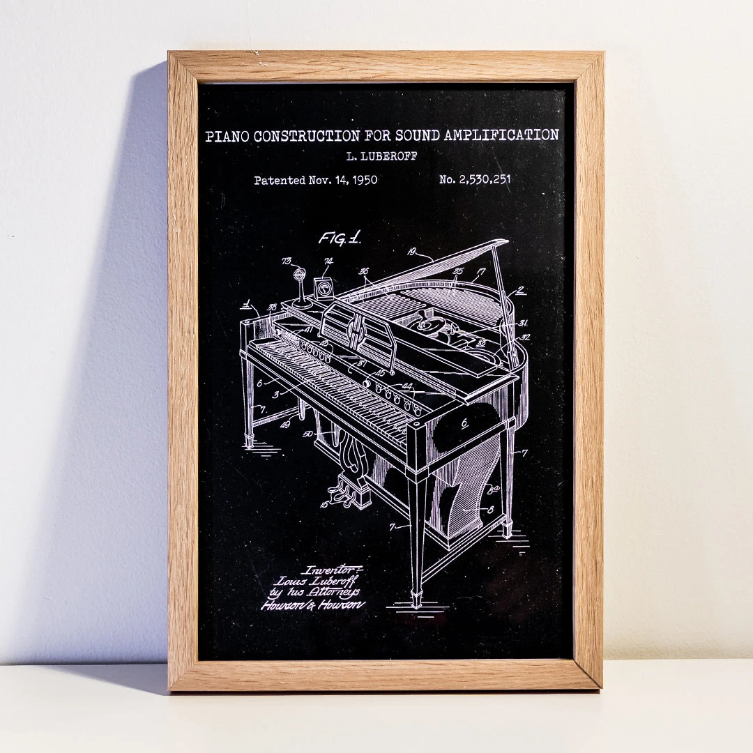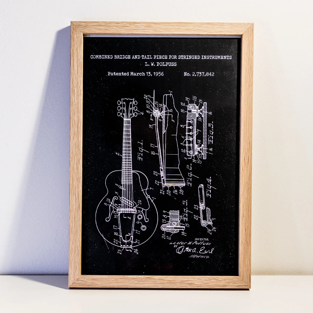 Each print uses the real patent design and information, including the signature of the inventor. It’s a great way to pay homage to the history of music while still creating an interesting and unique display that doesn’t make it feel like a back alley pub plastered in band posters.