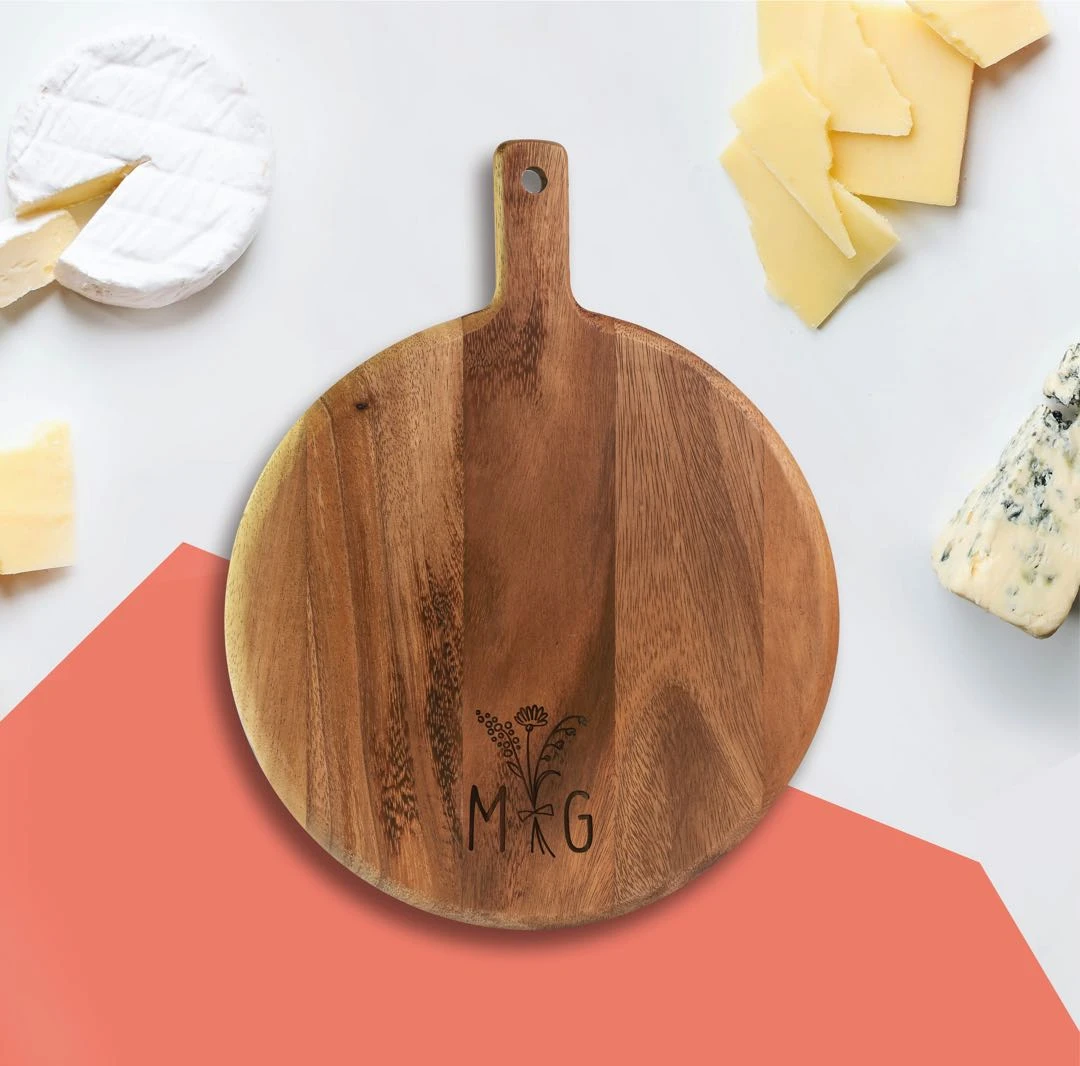 Your kitchen and cooking creations will be even more beautiful with this personalised serving board. The board is a round paddle with a hole in the handle to easily display your unique design in the kitchen. It measures 38cms from top to toe, with a 30cm diameter for the main board. The acacia wood creates a unique grain for each board, so you’ll know it’s just for you.Â