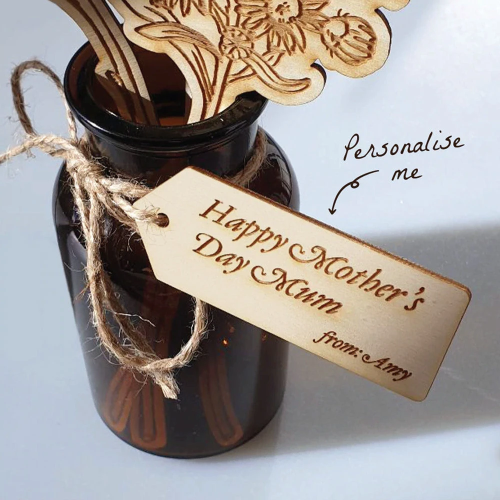 Precision cut and etched from 3mm premium plywood, the lovely bouquet measures 26cm tall. The bouquet is made up of 3 stunning wooden flowers; Arnica (sunflower), Wachendorfia (perennial), Lilly of the Valley (woodland flowering plant), beautifully presented in a rustic brown glass bottle.