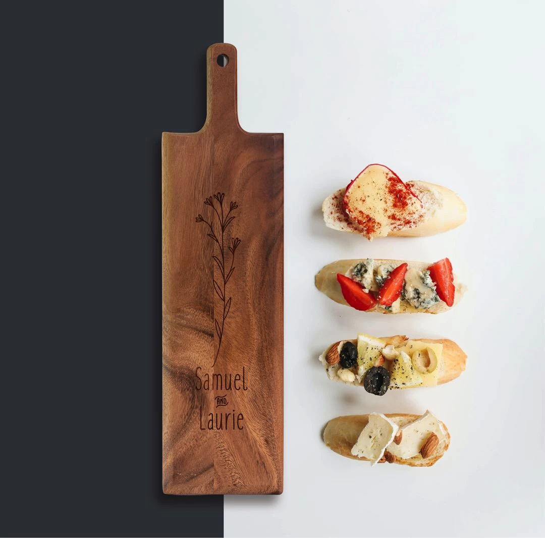 Celebrate your classic style with this beautiful personalised serving board. The board is an elongated rectangle paddle design with a hole in the handle to easily display your unique design in the kitchen. It measures 44cms from top to toe, with 35.5 x 12 cm of serving space. The acacia wood creates a unique grain for each board, so you’ll know it’s just for you.Â